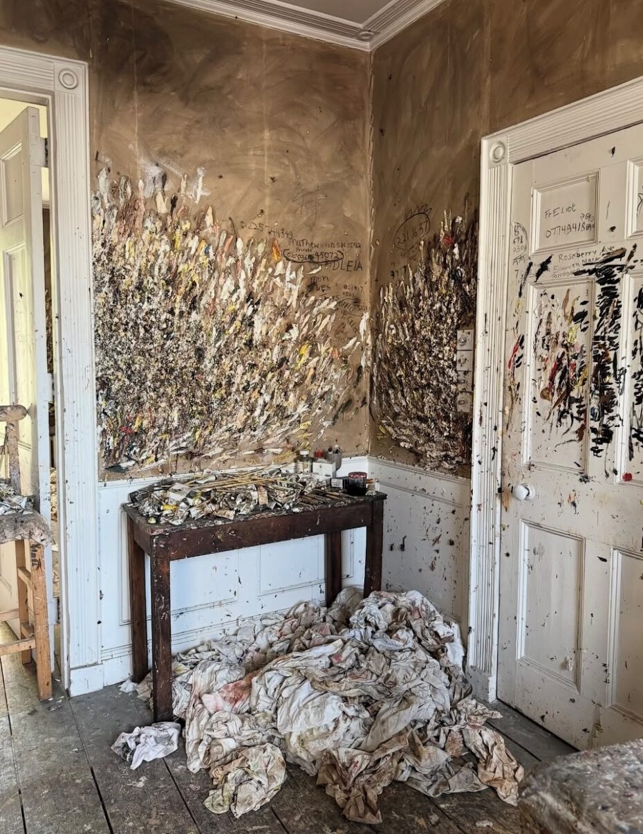 Phone numbers still scrawled across the walls. Scissors, once used to trim paintbrushes, remain wedged into layers of dried paint. Mountains of rags worn from years of wiping his brushes.