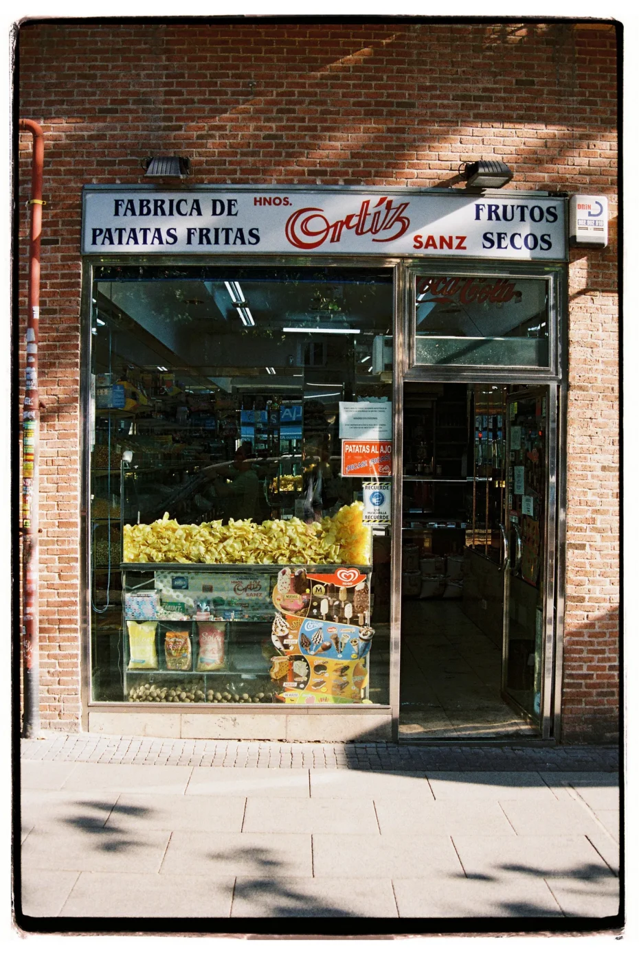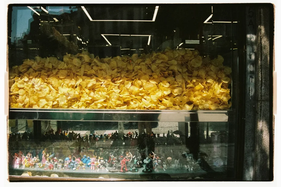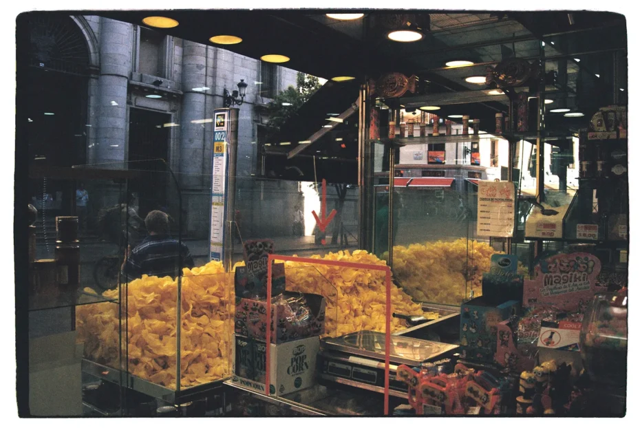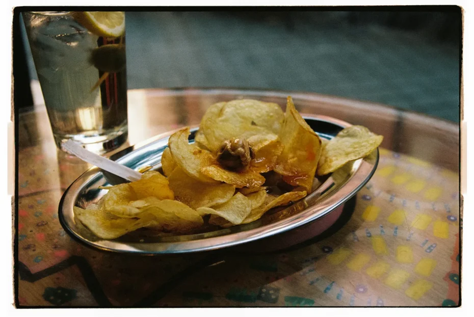 Spain, like the UK, has a big crisp culture, with fun regional differences in how they’re consumed. In Catalunya for example, you’ll often see crisps and berberechos (tinned cockles) topped with Salsa Espinaler during ‘L’hora del vermut’ (‘vermouth hour’) on a Sunday…. Not only are they to be found in bars across the city, but they also light up the streets of Madrid through the windows of glorious little shops known as fábricas de patatas fritas — quite literally, ‘crisp factories’.